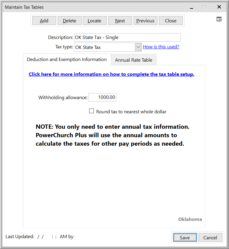 Click Add to enter a new table, or use the Find/Locate buttons to select an existing OK tax table to update. When adding a new table, you will be prompted for the type of tax table you're adding. Select State: Oklahoma. For each table, enter the following information: