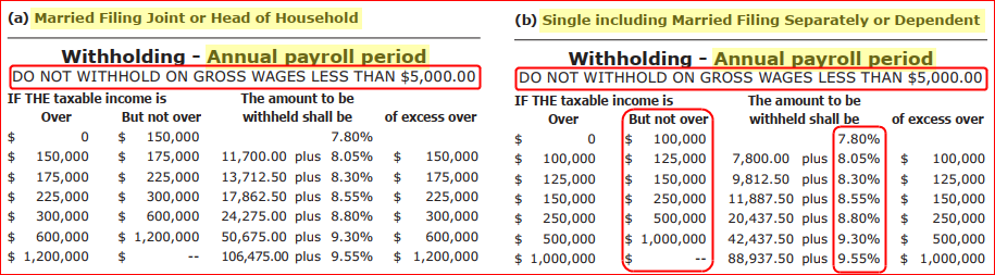 - Do not withhold on gross wages less than: If wages are below a minimum value, taxes are not to be withheld. Enter annual minimum amount which is found in the rate table (see Figure 1).