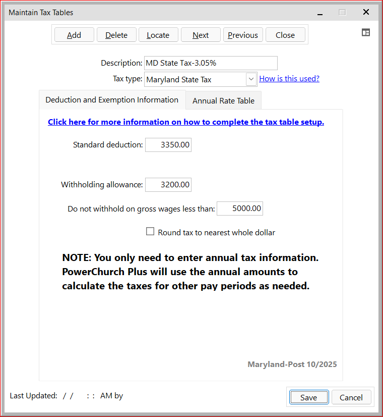 The Maryland state withholding calculation was redesigned in October 2025. In PowerChurch, you will find tax tables "Maryland Pre-10/2025" and "Maryland Post-10/2025". Use the Post-10/2025 version for tax year 2025 and beyond.