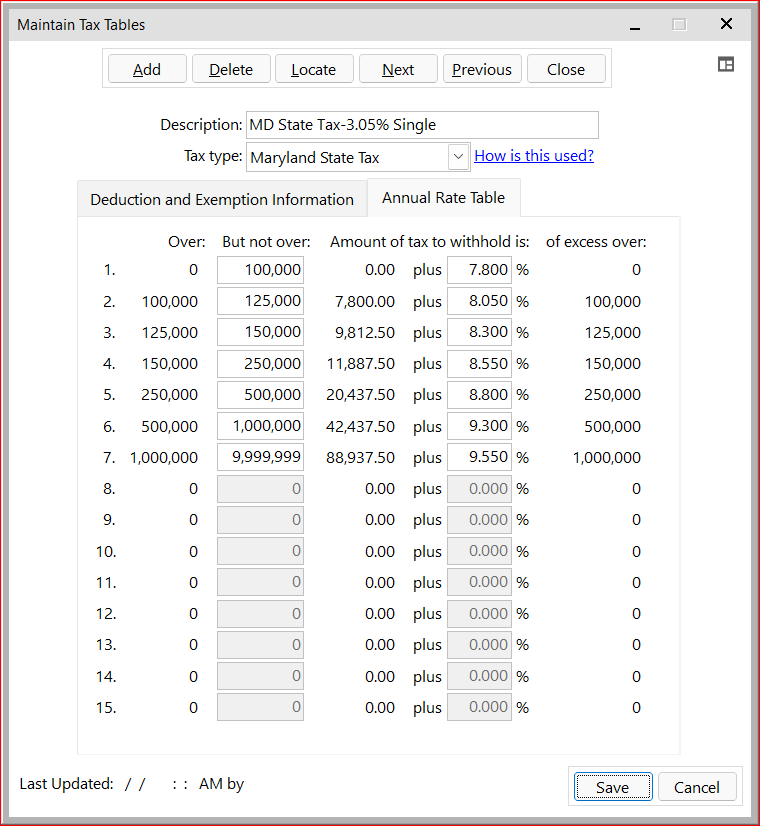 - Description: Enter a unique name to identify the tax table (for example, "MD State Tax-3.05% Single").