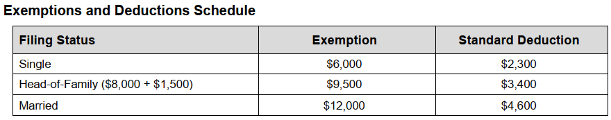 - Standard deduction: Enter the amount for the standard deduction plus the marital status personal exemption amount. This varies by single, head of household, or married table. Figure 1 shows the Exemption and Standard Deduction amounts schedule, pulled from the "Summary" page at the beginning of Publication 89-700.