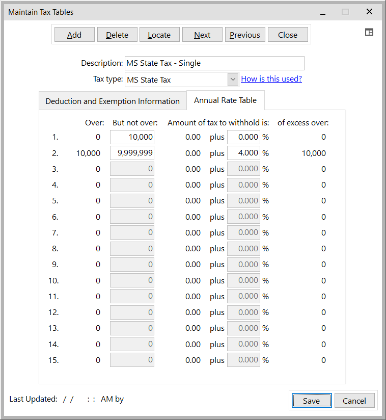Click Add to enter a new table, or use the Find/Locate buttons to select an existing MS tax table to update. When adding a new table, you will be prompted for the type of tax table you're adding. Select State: Mississippi. For each table, enter the following information: