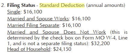- Standard deduction: Enter the amount for the standard deduction. This varies by filing status of single or married and spouse works, married and spouse does not work, and head of household (determined by what is checked on Form MO W-4). This rate is found under Step 1 of the "Missouri Withholding Tax Formula" instructions. Figure 2 shows an example.