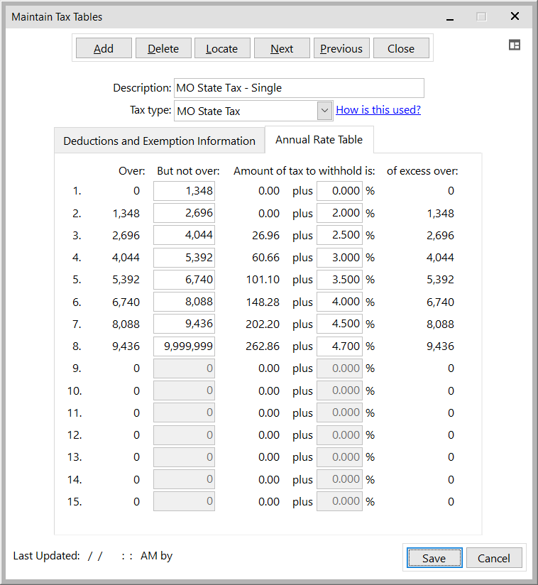 - Description: Enter a unique name to identify the tax table (for example, "MO State Tax - Single").