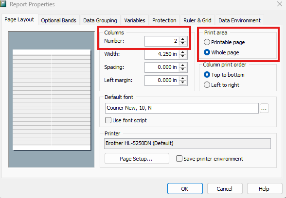 - You will now need to direct the Custom Report Writer to print the names in columns. To do this, click on File and go to Page Setup. If you have a 20 label sheet, set the columns to 2. For 30 label sheets, set the number of columns to 3. In addition, you need to set the Print Area for this report to Whole Page. Click OK.