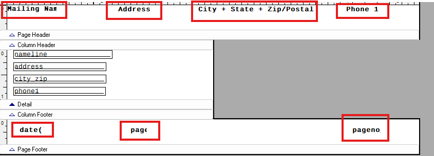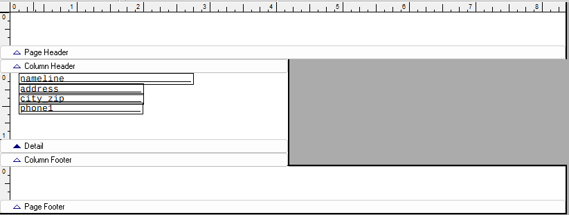 - Now you will need to line up the fields in the detail band (just below the gray Column Header bar). You do this by clicking on the fields, holding down the left mouse button, and dragging them underneath one another.