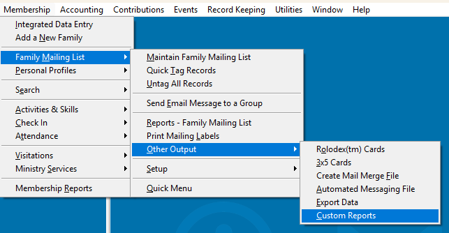 - If you are using a version prior to 11, there will be no other output option; the Custom Reports option will be directly under the Family Mailing List module.