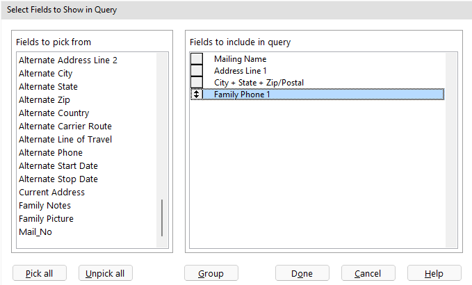 - Step 5 will be selecting the fields you want to display on the mailing labels. From the "Fields to pick" section, simply double click on the fields you would like to include on the label. For this example, we will include Mailing Name, Address Line 1, City+State+Zip/Postal, and Family Phone 1. This is where you could include additional fields like Visit Area. When you are finished, click done.