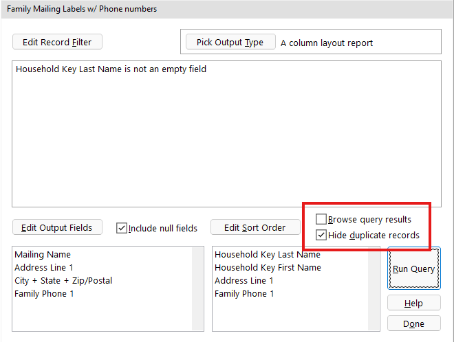 - Now we are on the Query Overview Screen. From here you will need to check the Hide Duplicate Records box. This will prevent multiple labels from printing for the same family. You will also need to uncheck the Browse Query Results box.