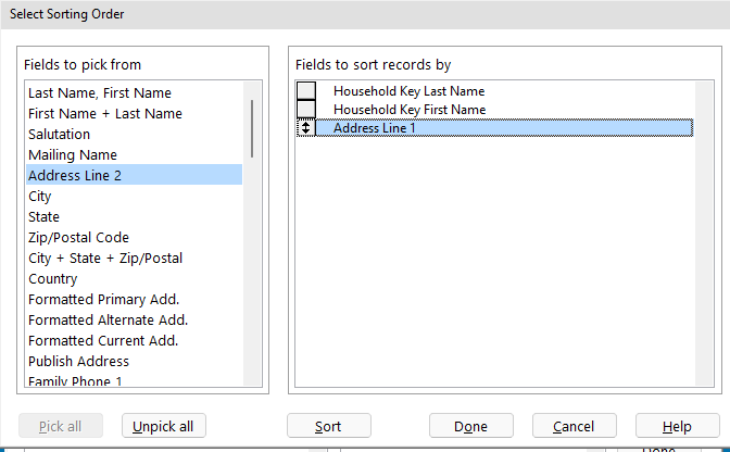 - The last step before we run the query will be to change the sort order. Click on the Edit Sort Order button. Select the following fields, in order, to sort alphabetically: Household Key Last Name, Household Key First Name and Address Line 1. When you are finished, click on Done.
