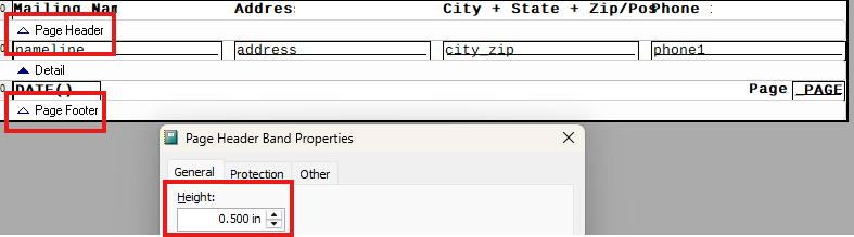 - First, double click on the grey band Page Header and set the height field to be 0.5 inches. Do the same for the Page Footer band.