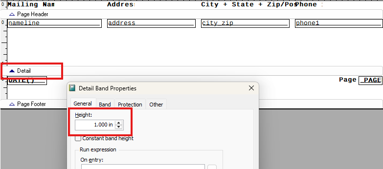 - Double-click on the Detail band and set its height to 1.0 inch.