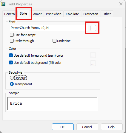 - An optional step would be to change the name tags font. To do so, start by double clicking on the field label firstname or lastname. This brings up Field Properties. Click on the Style tab and here you will see the font details. Click on ellipsis to bring up the customization menu, here you can select any font options you want and click OK.