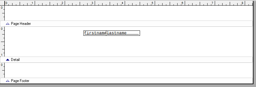 - Lastly, we need to resize and move the fields so that they align better on the name tags. Start by selecting the firstname field and dragging the field corners to remove the white space at the end of the field. Next, move it to the center of the detail and page header bands. Finally, select the lastname field and drag that right behind the firstname field.