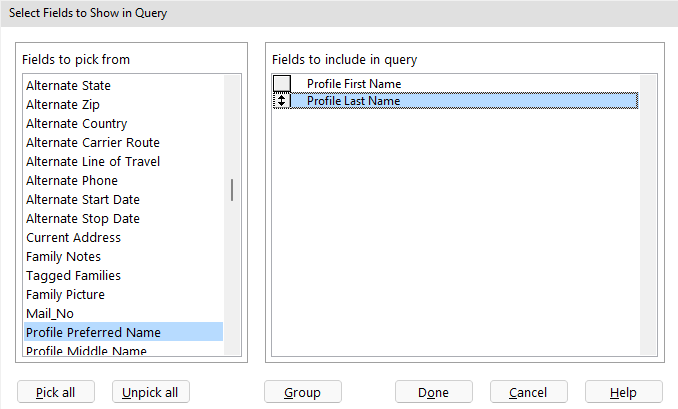 - At this point, you will be prompted: Do you want to run this query now? Click Yes. Here we will need to define the output fields. Do so by simply double clicking on the desired fields; this will move them to the included section. Select Profile First Name and Profile Last Name in the “fields to pick from” section. Optionally, you could select other fields here as well.