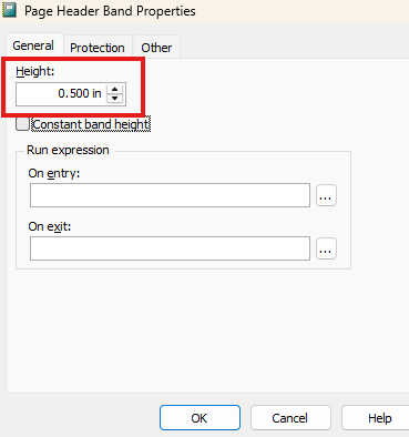 - From the Report Designer Screen, start by adjusting the height of the following bands. Do so by double clicking on each band and entering the height value on the general tab.