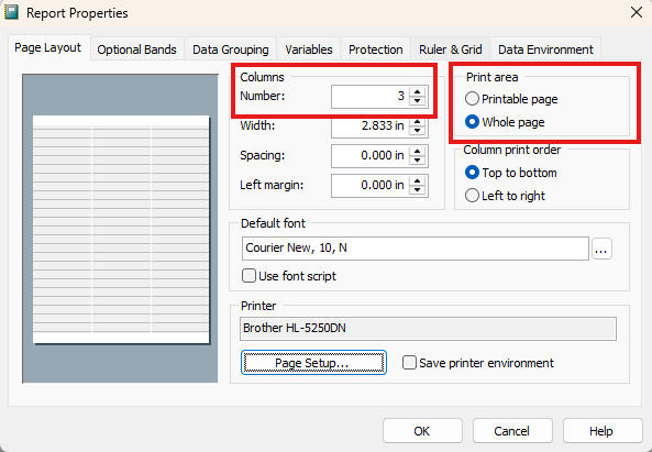 - You will now need to direct the Custom Report Writer to print the names into 3 columns. To do this, click on File and go to Page Setup. Set the columns to 3. In addition, you need to set the Print Area for this report to Whole Page. Click OK.