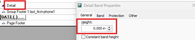 - Highlight the last_first and phone1 fields and drag them above the Group Footer band that you just opened up. You can then change the Detail band height to 0.000 by double clicking on it and modifying the height.