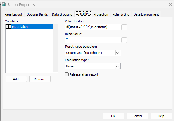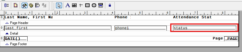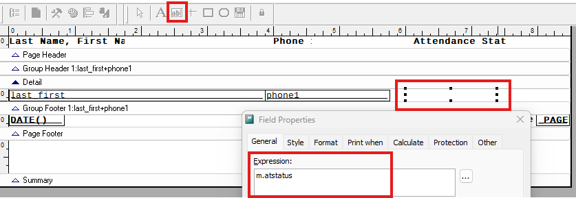 - Back in the Report Designer, click the Field tool (the "ab|" button) then click into the Group Footer next to the phone1 field. In the Expression field that opens, enter m.atstatus and click OK.