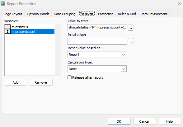 - In the Value To Store field, enter "iif(m.atstatus="P",m.presentcount+1,m.presentcount)"