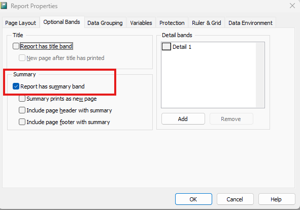 - Click the right mouse button on the Group Footer band and choose "Optional Bands". Under "Summary", check the Report Has Summary Band option, then click OK.
