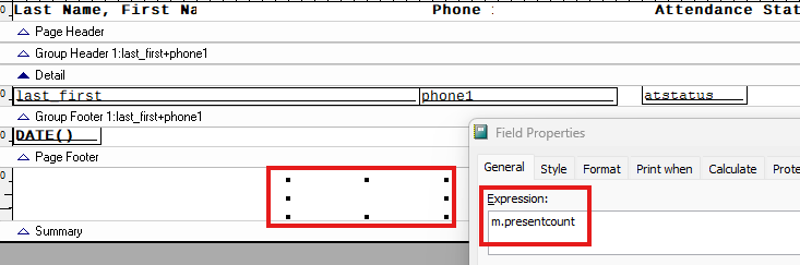 - Click the Field tool (the "ab|" button) then click into the new Summary band that opened at the bottom of the Report Designer directly below the atstatus field. Enter m.presentcount in the Expression field that opens, then click OK. Widen the new field by clicking and dragging the right edge of the field.