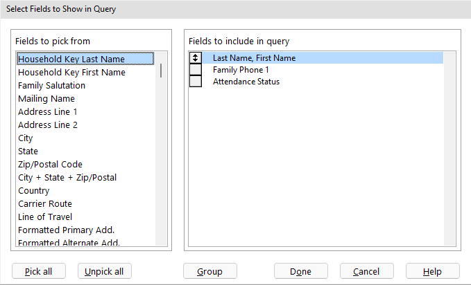 - At this point, you will be prompted: Do you want to run this query now? Click Yes. Here we will need to define the output fields. Do so by simply double clicking on the desired fields; this will move them to the included section. Select Last Name, First Name, Family Phone 1 and Attendance Status from the “fields to pick from” section.