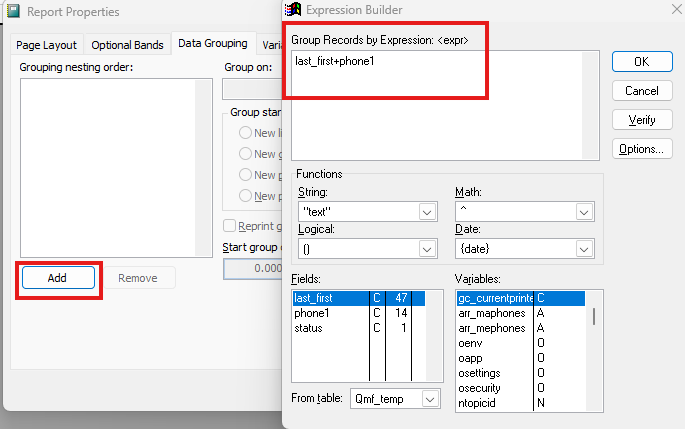 - Next, right click on the detail band and choose Data Grouping. Click the add button and enter “last_first+phone1”. This will group all results by the individual person. Click OK.