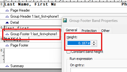 - Double click on the new Group Footer (last_first+phone1) and set the band height to 0.187.