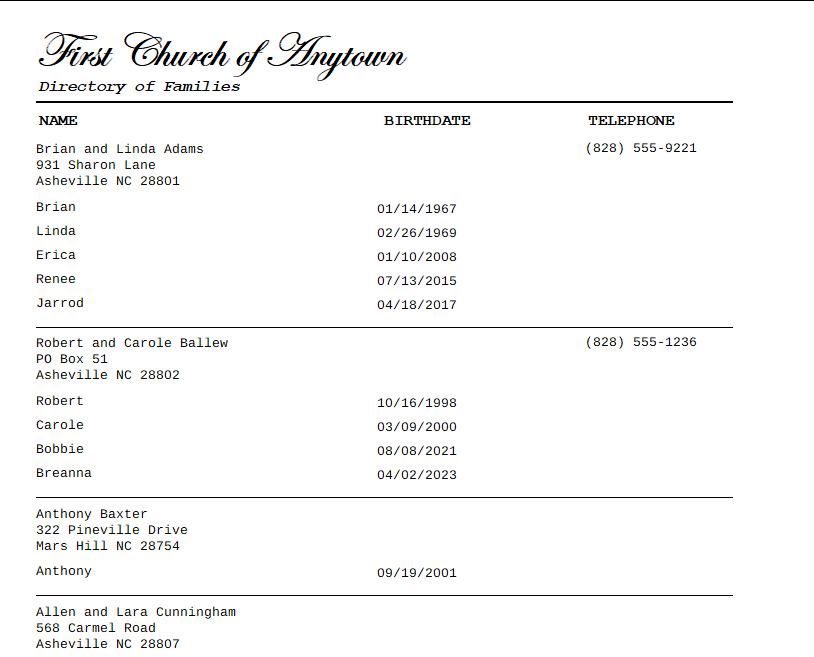 The purpose of this report is to teach you how to build your own custom church directory. Building a custom church directory will allow you to include fields that are otherwise not included in the standard church directory. In this example, we will include the birthdate, but other fields and customization could be added.