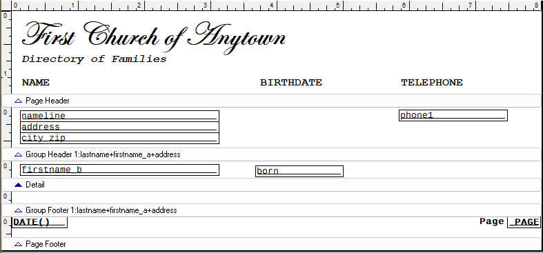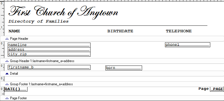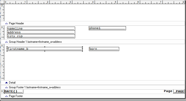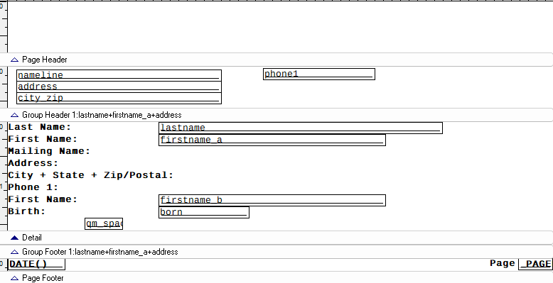 - Only the Firstname_b and born fields should remain. First select the firstname_b field and align it with the nameline field from above. Then select the born field and align that with the phone1 field above. If done correctly, it should look similar to the figure below.