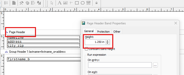 - We will now work on the Page Header for this report. Start by resizing the Page Header section like we previously did. Double click on the page header bar and enter 1.250 for the height.