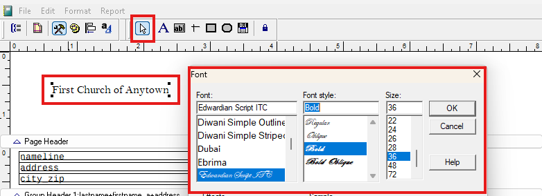 - Let's customize that title now. Select the pointer tool from the toolbar and then select the church name textbox. Then click on Format under the navigation menu and Font. Here you can customize the font to your liking.