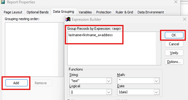 - The first thing we need to do is group each family member to his/her family. To do this, select Data Grouping from the Report menu. Click Add. In the Expression Builder dialog box, enter the following expression: lastname + firstname_a + address. Click OK, then OK again.