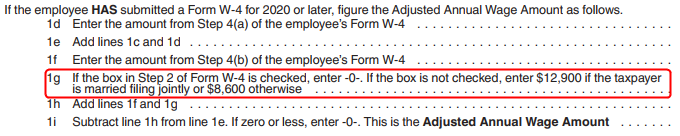 This section of the worksheet applies specifically to an employee who has submitted a W4 form for 2020 or later and has not checked the box in Step 2 on that form.