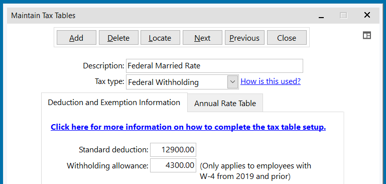 A Maintenance Release update for Versions 12 and 14 added an optional Standard Deduction field on the Federal Withholding tax tables and a Use Standard Deduction checkbox option was added to the employees' Federal Withholding deduction items.