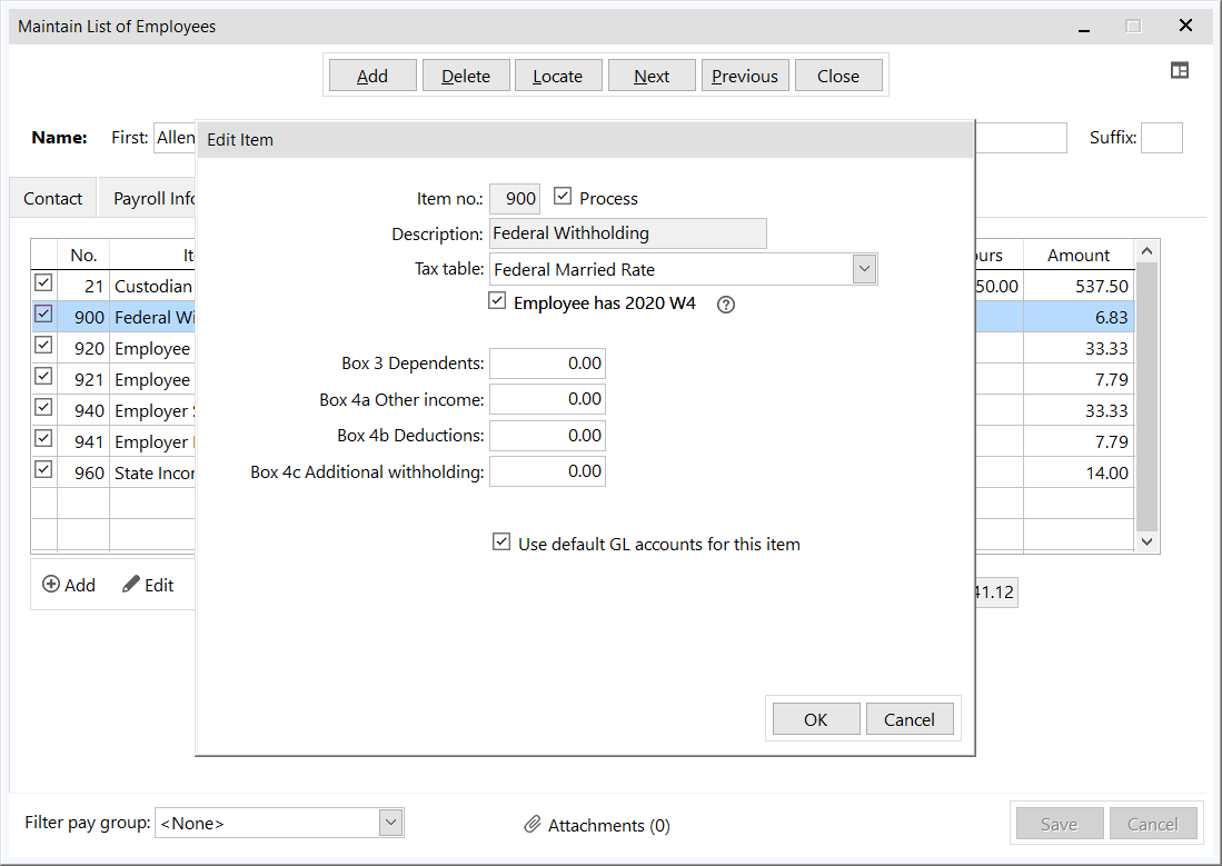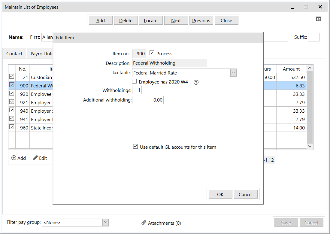 The employees' Federal Withholding item was redesigned in Version 15 to more clearly and accurately set up each employee's preferences from their W4. From the Maintain List of Employees screen, click on the Pay Items tab, then double click the employee's Federal Withholding deduction item.