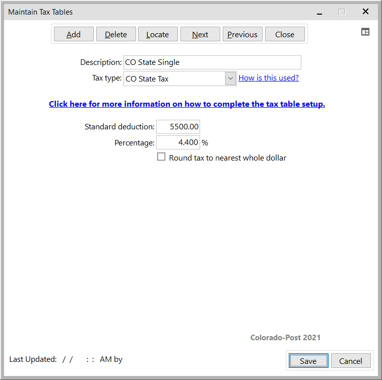 - Description: Enter a unique name to identify the tax table (for example, "CO State Tax - Single").